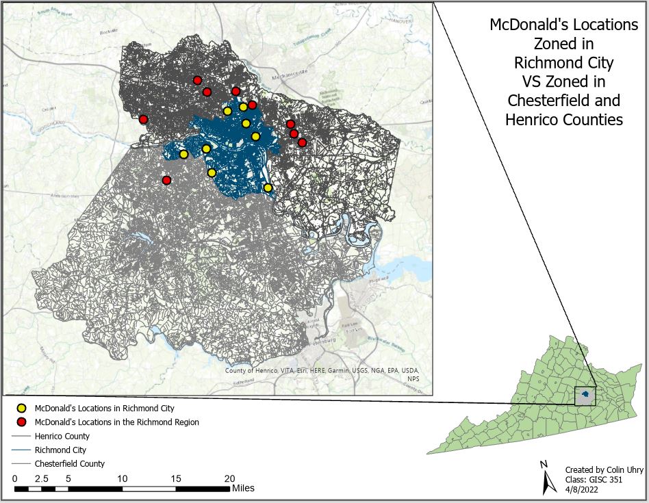 For my spatial analysis class, one of the last major labs we were tasked to do was create a locator and see which McDonald’s locations were actually zoned inside the city of Richmond vs which were zoned in the bordering counties, all while saying they were in Richmond for the publicity. As shown in Figure 1, there were 17 McDonald’s locations in the area of interest, with all of them saying they were in