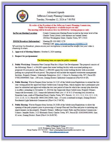 Part of the major site plan process is presenting a concept plan to the Planning Commission, and when word got out this concept plan was happening boy did we get public comments. After compiling all public comments and putting them into the meeting packet, which can be read below, we also had over 100 people show up for public comment. After careful deliberation, the Planning Commission voted to send back the concept plan and requested more information, with more details being available in the West Virginia Independent Observer and Spirit of Jefferson newspapers.